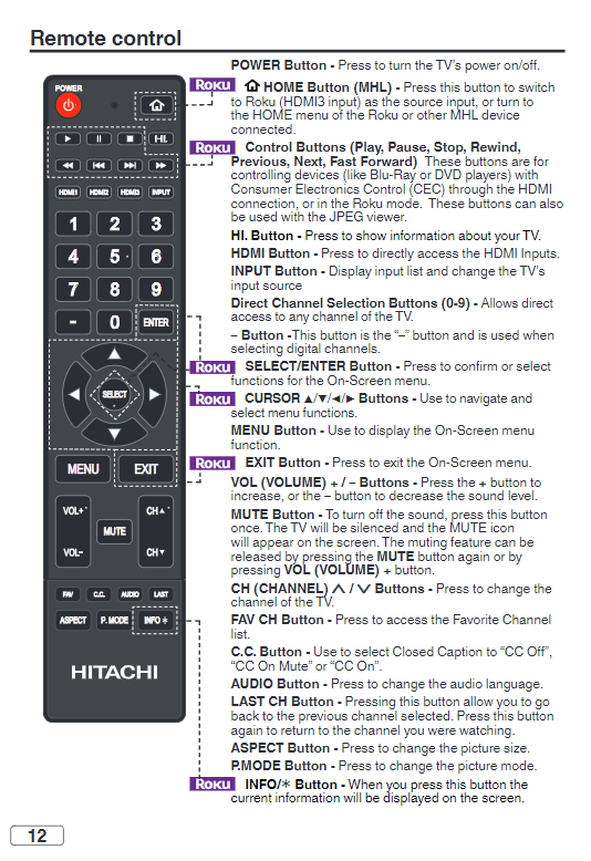 The remote control on page 12 shows that the Hitachi TV is a Roku-powered TV, which means that the way to display videos is to use the Roku Media app.
