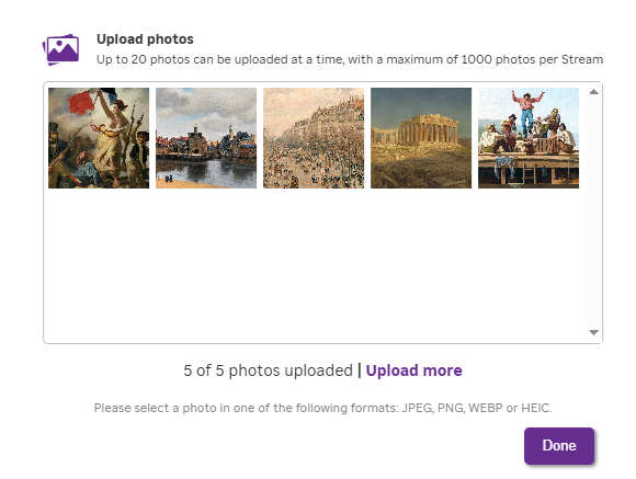 You can upload up to 1000 images from the BillionDollarArtGallery to Photostreams or Backdrops by following this procedure: